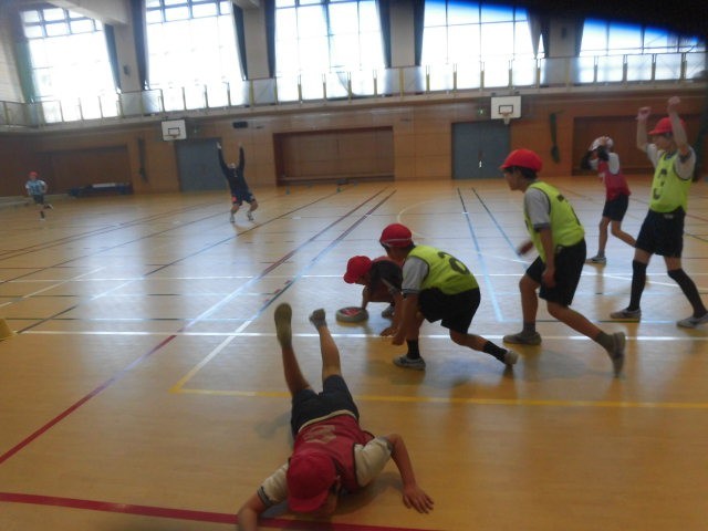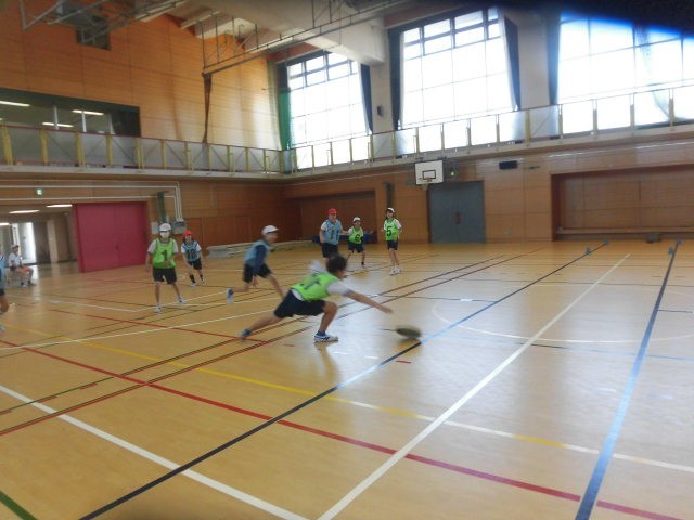 フリスビーに似たスポンジのドッジビーをパスを使ってコートのはじまでつないでいきます。