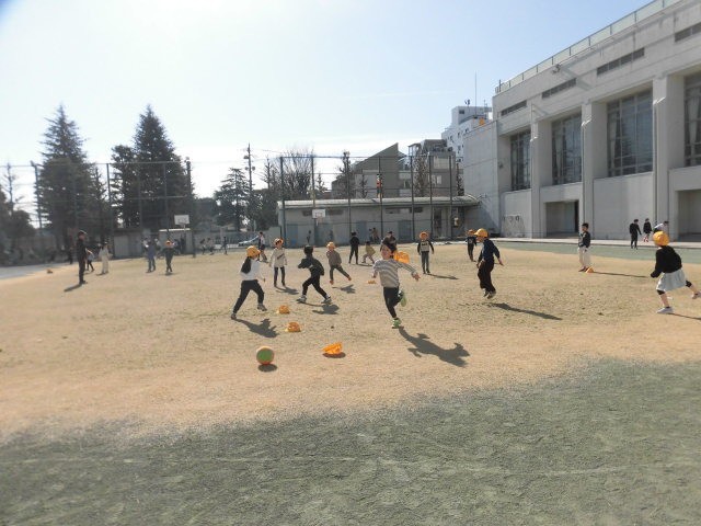 お日さまが子どもたちを照らし、とてもあたたかい中休みです。たくさんの子どもたちが遊んでいます。