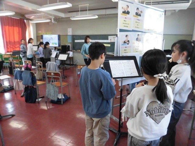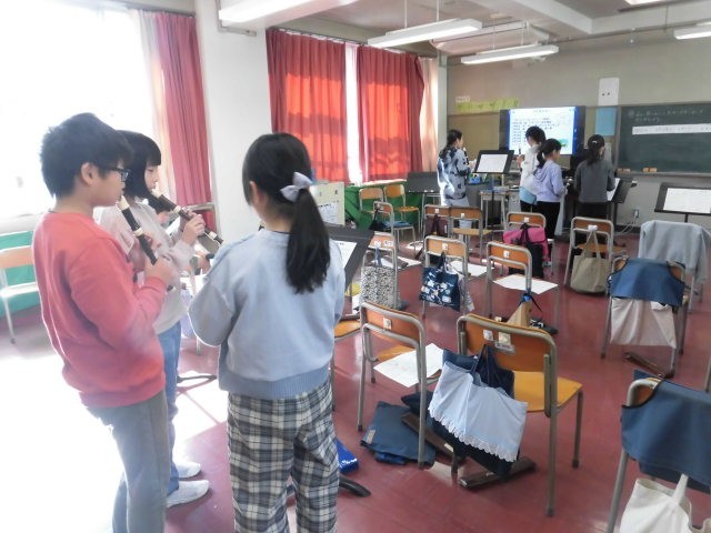 子どもたちはグループを作って練習をしています。友達と息を合わせリズムを合わせています。みんなで声を掛け合って練習をしている4年生です。