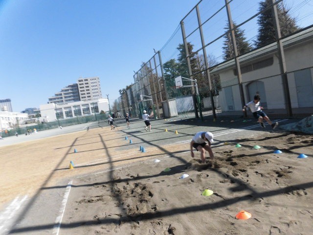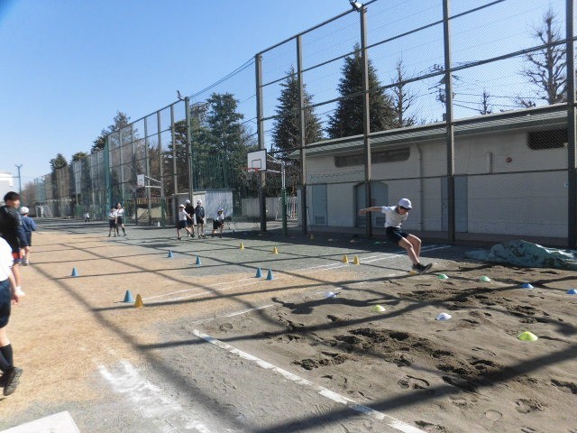 子どもたちは最初砂場ではなく踏切版の上で踏み切り、マットに向かって跳んでいます。跳び方や着地の確認をしています。そのあと、実際に砂場で跳躍をします。足が引き付けられ高く跳んでいる人がたくさんいます。みんな何度も練習に取り組んでいました。