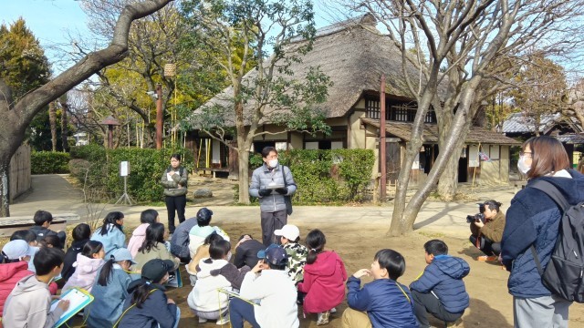 次大夫堀公園に着きました。藁葺き屋根の家を見て、何時代?と、聞いてくる人がいました。興味津々な子どもたちです。