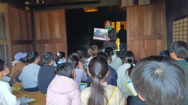 子どもたちは、藁葺き屋根の家の中に入っていろいろな説明をしてもらいました。