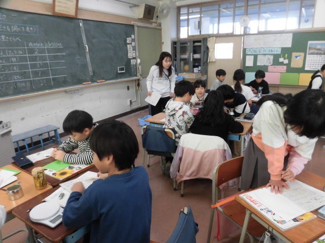 はかりを使って、いろいろなものの重さをはかっています。手で触って重たい順に順序を予想していました。実際にはかりではかってみると、意外な結果になったようです。ものをまとめて一緒にはかる班もありました。その時に、おもしろいことに気付いていました。その気づきの様子がとてもすてきでした。