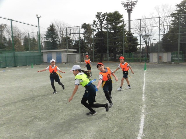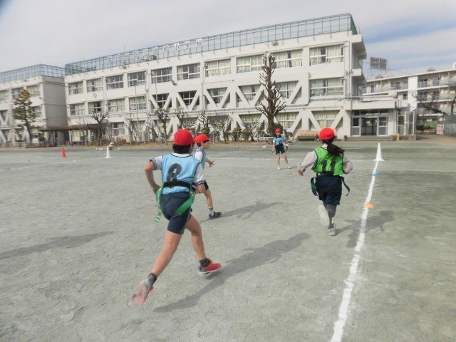4年生の授業はフラッグフットボールです。タグを取られないようにしながら、ボールを前に運びます。
