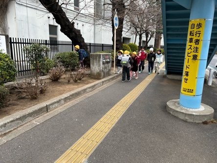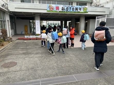 6年生と1年生が手を繋いで歩いています。見ていてあたたかい気持ちになります。