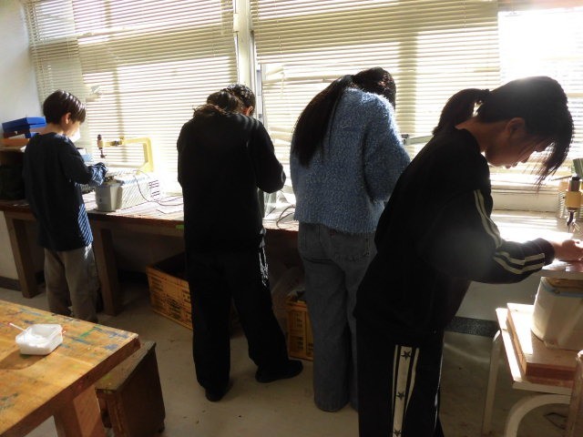 一枚の板を使って、一人ひとり考えた立体作品を作ります。自分でデザインを考え採寸をしています。早い人は、電動のこぎりを使って木板を切っています。それぞれどのような作品になるのか楽しみです。