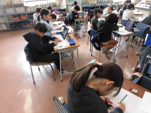 3年生の授業は国語です。「たから島のぼうけん」と題して、子どもたちは物語を書いています。前時までに登場人物や出会うものなどの設定を考えています。その設定に合わせて、子どもたちは原稿用紙に文章を綴っています。作家さんのようです。前回まで書いていたメモをじっくりとながめて考えている人もいます。