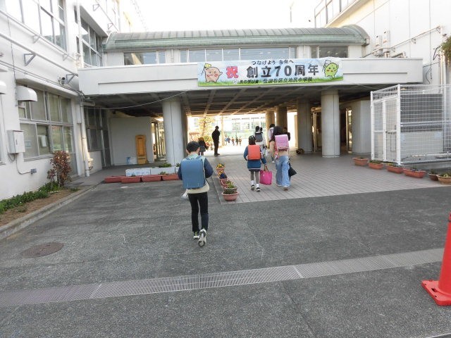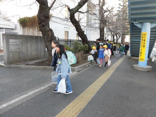 子どもたちが登校してきました。今日はあたたかい朝です。上着を着ていない人もたくさんいます。手袋をしている人はあまりいないようです。
