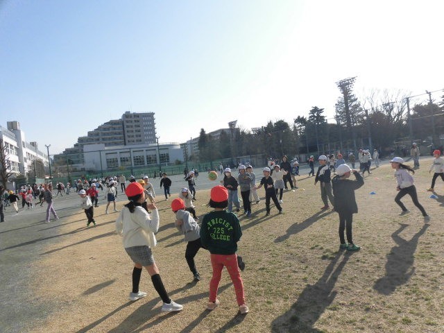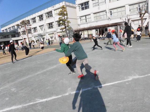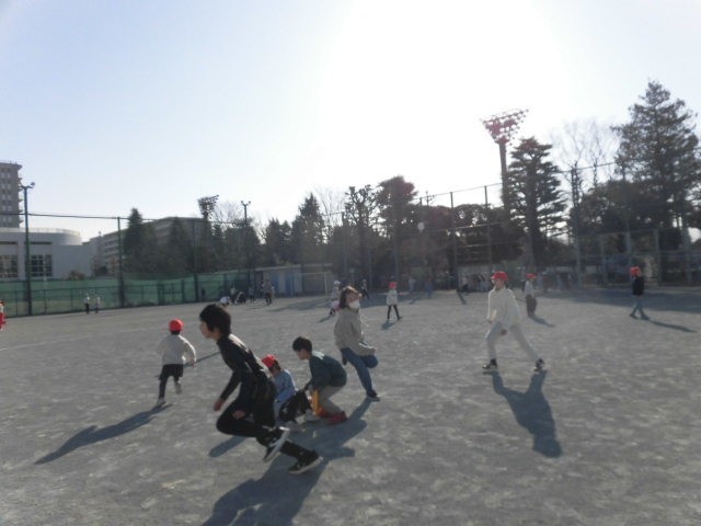 今日の朝の活動は朝遊びです。子どもたちが校庭を走り回っています。
