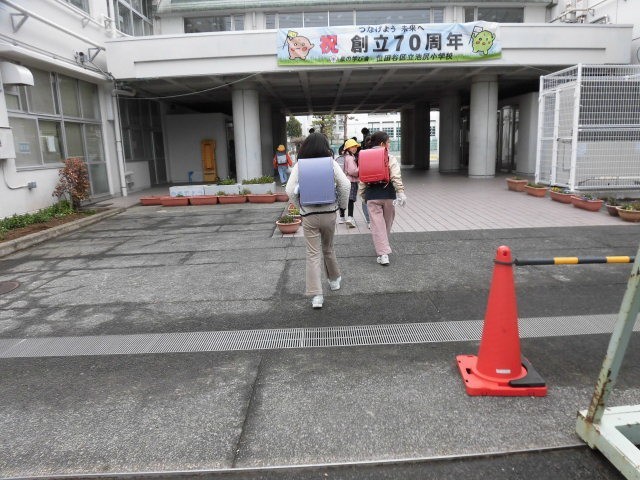 子どもたちが登校してきました。夜中の雨のせいか、まだ暗さが残っている朝です。かさを持って登校する人もたくさんいました。