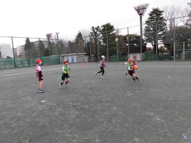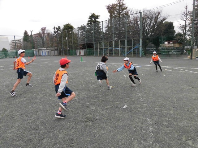 3年生の授業はフラッグフットボールです。子どもたちはうまく相手をかわしてゴールを決めています。ゴールを決めて友達や先生とハイタッチをして喜んでいるチームもあります。みんな楽しそうにゲームをしています。