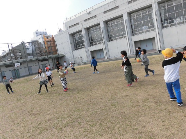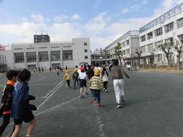 子どもたちは中休みの初めにマラソンをしています。兄弟で一緒になかよく走っている人もいます。