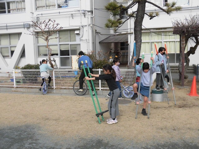 ボール遊びをしている人がたくさんいます。一輪車に挑戦し子どもたちに教えてもらっている先生もいます。