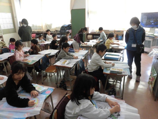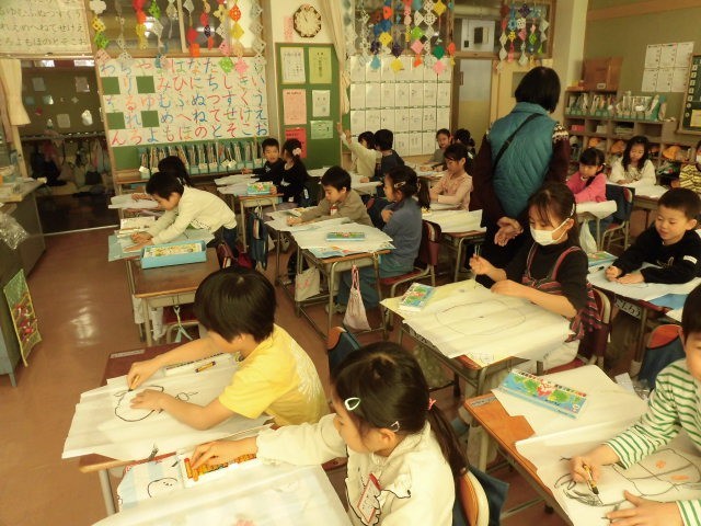 1年生は手作り凧に絵を描いていました。いろいろな絵があります。動物たちを描いている人がたくさんいました。近くをまわっていると、自分が描いている絵の説明を嬉しそうに説明をしてくれる1年生です。