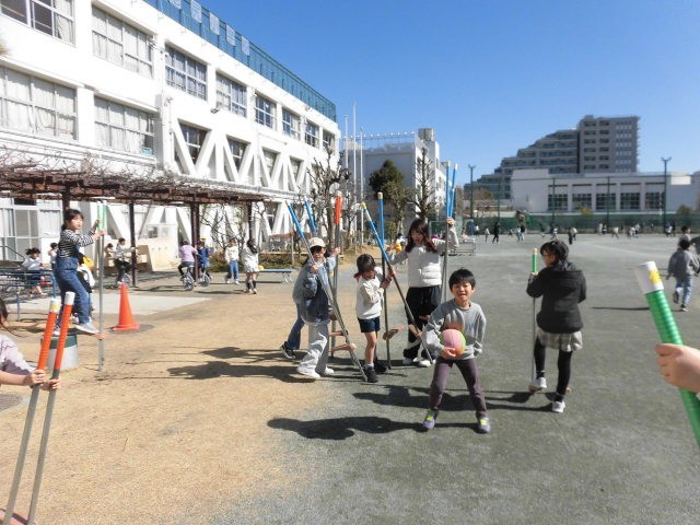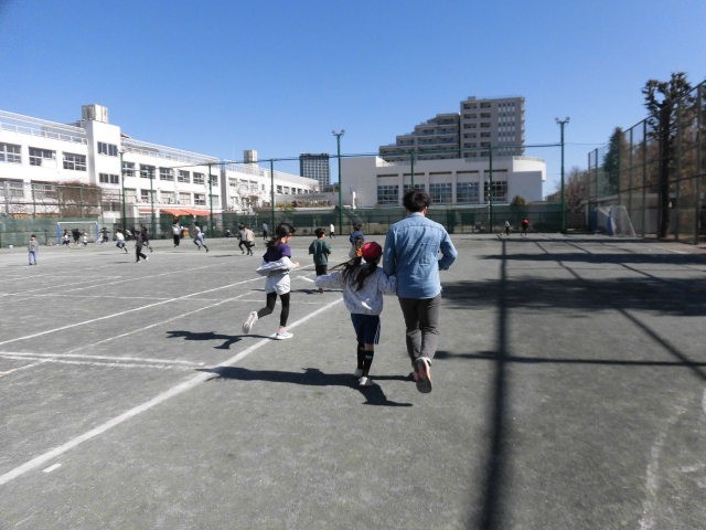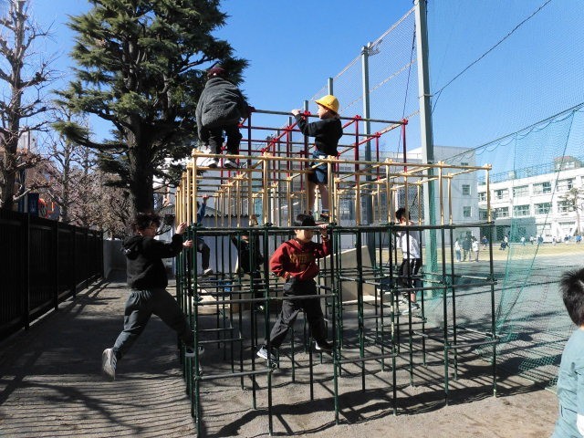 休み時間の初めはマラソンタイムです。子どもたちは元気に走っています。ボール遊びやおにごっこだけではありません。一輪車や竹馬、ジャングルジムなどでも遊んでいる子どもたちです。