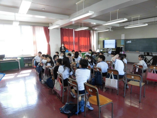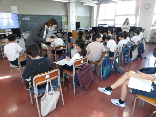 「何の楽器が主役になっての演奏でしょう。」授業はじめのこの問いに子どもたちは、背面にある楽器の写真を見ながら演奏を聴いています。そのあと、子どもたちは最初トランペットについての説明を聞きました。そこに居合わせた副校長先生が急に話を振られ、トランペットを持たされました。副校長先生もびっくりしています。しかし、副校長先生は「トランペット吹きの休日」を見事に演奏したのです。子どもたちは、びっくりです。立ち上がって喜ぶ子もいます。ヒーローになった副校長先生の活躍で、子どもたちのトランペットへの興味はグンとあがりました。
