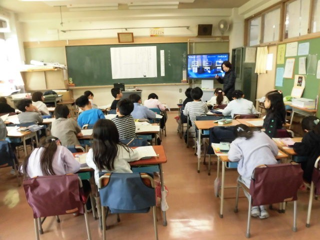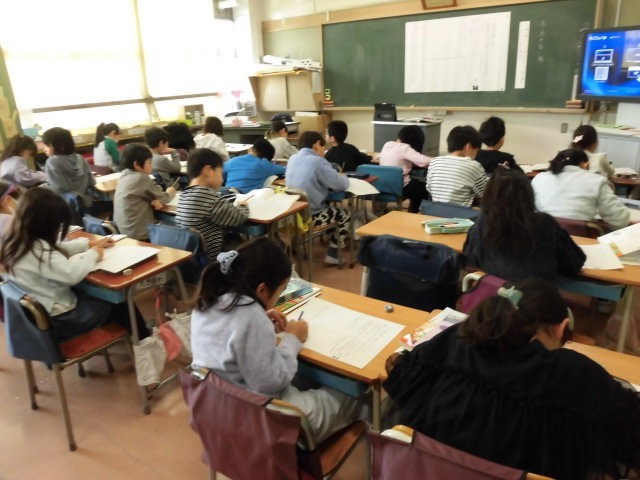 登場人物がどのような気持ちになったかをワークシートに書きこんでいます。一人ひとり静かにワークシートに書きこんでいる子どもたちです。
