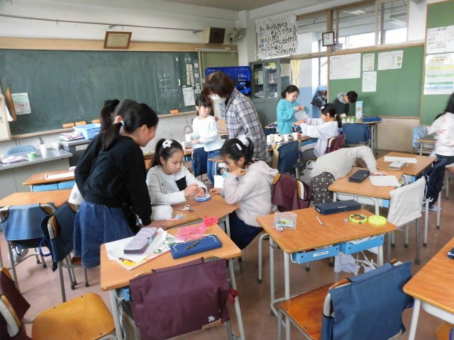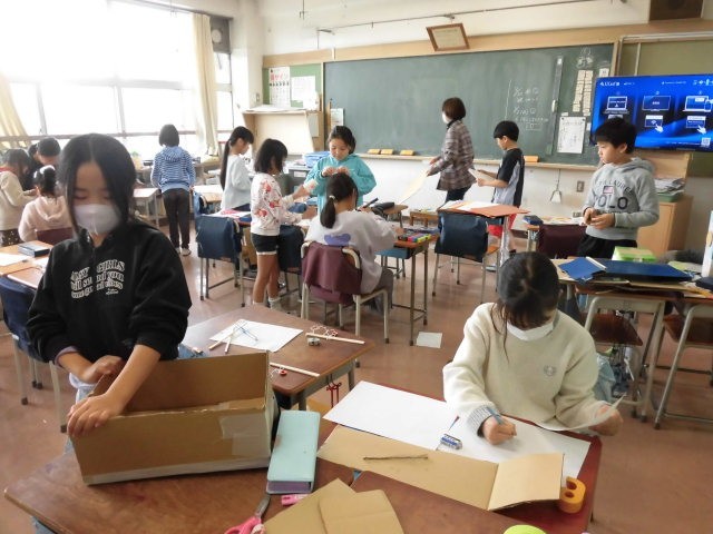 3年生の授業は理科です。この一年間で学習したことを生かして、おもちゃ作りをしています。ゴムの力を利用したおもちゃ、磁石の力を利用したおもちゃ、いろいろなおもちゃがあります。出来上がった人はさっそく試しています。「見てみて!」子どもたちから嬉しそうに声をかけられました。