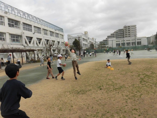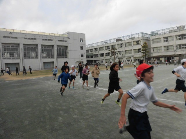 中休みです。はじめにマラソンタイムです。子どもたちはトラックを走っています。