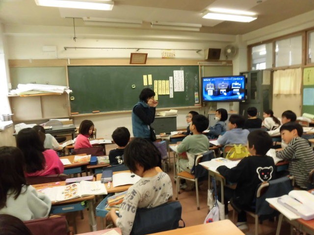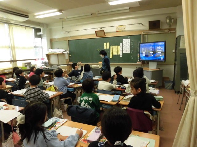 「□ー□」「□ー□ー」に当てはまるカタカナの言葉をみんなで探しています。子どもたちは教室を見渡したり、道具箱の中を見たりしています。「見つけた!」嬉しそうに声をあげる人もいます。沖縄に旅行に行った時のことを思い出して言葉を探した人もいました。すると、先生が「シーだよ。」と、口に指をあて静かにと言うように、ヒントを出していました。それに気付いた人もいました。楽しく学習をしている2年生です。
