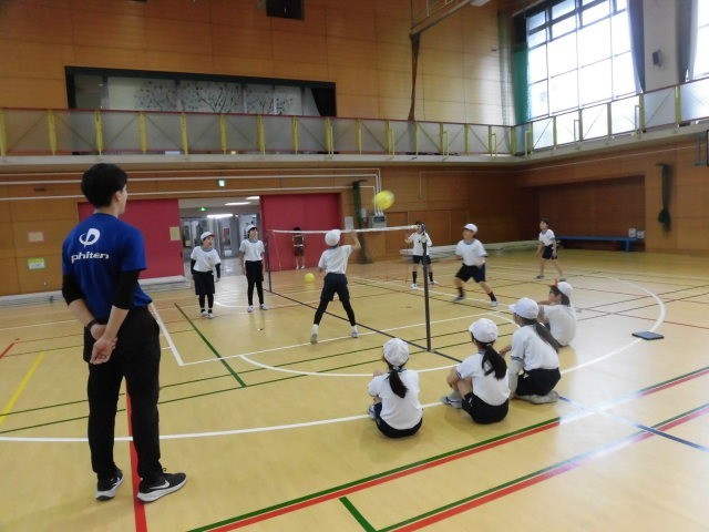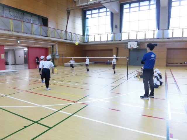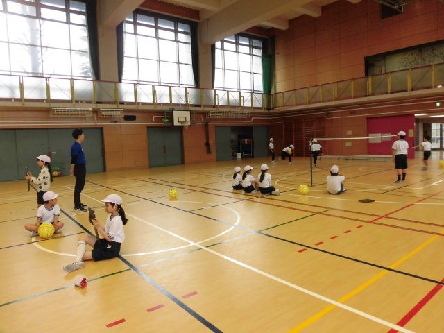 ゲームを始める前、子どもたちはチームで円になり、ボールをはじく練習をしていました。ゲームが始まると相手のコートにボールを落とそうと仲間と声を掛け合って動きを決めています。得点が決まると、みんなで声をあげて喜んでいます。みんなが楽しそうな4年生です。