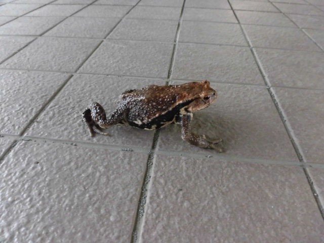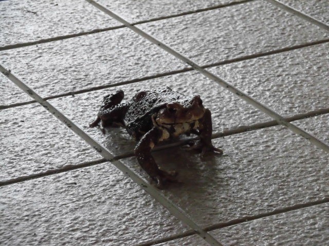 授業時間中、ピロティを通った時のことです。何か落ちているなあと、思って見てみると、何と、カエルでした。かなりの大きさです。
