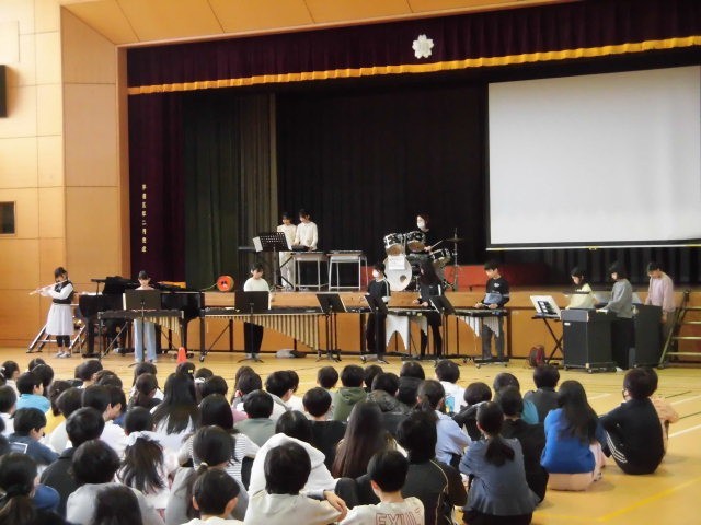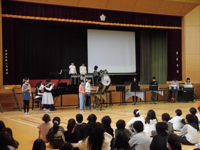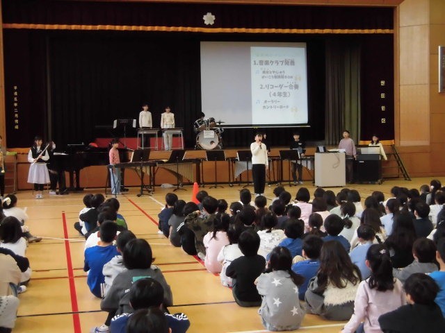 演奏する曲目は、「美女と野獣」「かいこう無限BGM」です。いろいろな楽器があります。1曲目と2曲目では担当する楽器が変わる人がいます。子どもたちは、緊張しながらも、とてもすてきな演奏を聴かせてくれました。始まりと終わりにあった代表の6年生からの言葉もすてきでした。