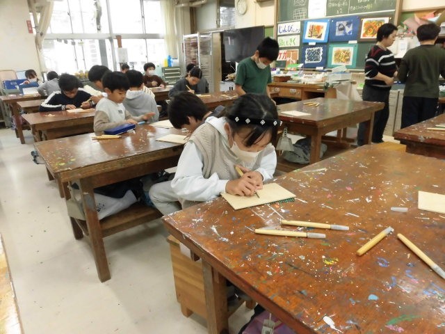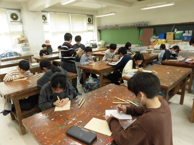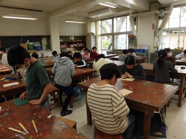 子どもたちは木板を彫刻刀で彫っています。模様をデザインしています。子どもたちは楽しそうに彫刻刀を動かしています。あまりやったことのない作業なので楽しいでしょう。どんな作品ができあがるのか楽しみです。
