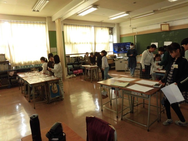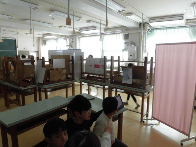 このお店は射的迷路です。歩いていく先に射的をするところがあります。家庭科室のお店は迷路です。迷路の途中にいろいろな仕掛けがあるようです。最後の写真のお店は暗号クイズです。広げてある言葉から暗号を推理します。子どもたちはみんな楽しそうです。