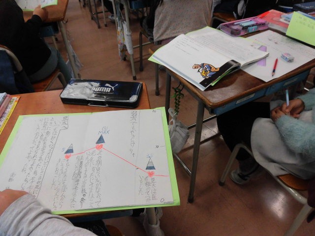 子どもたちはワークシートに読み取ったことを書き込んでいます。心情曲線や図などを書き入れている人もいます。自分たちで学習を進めている子どもたちです。
