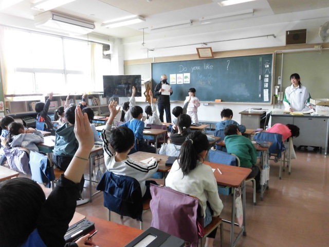 2年生の授業は外国語です。ALTの先生が来ています。