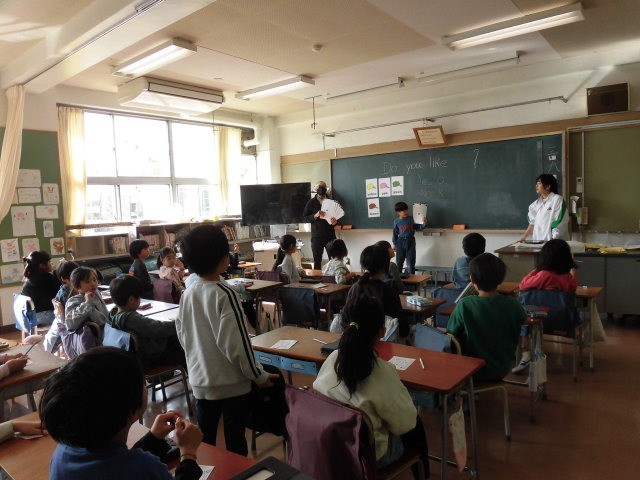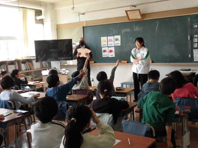 「Do you like」の話型に合わせ、好きな色のあてっこをしています。子どもたちは、楽しそうに