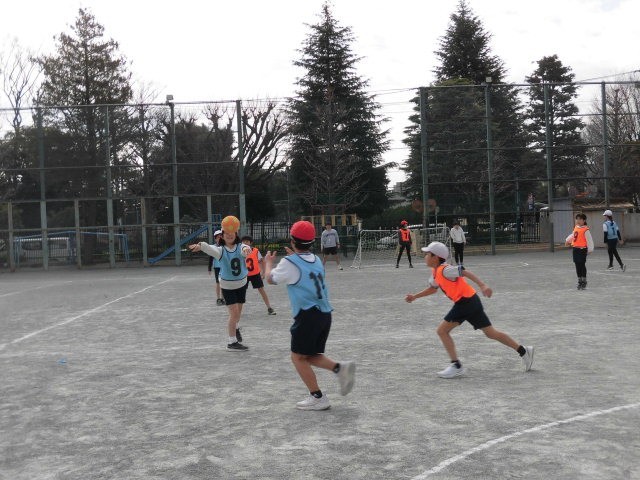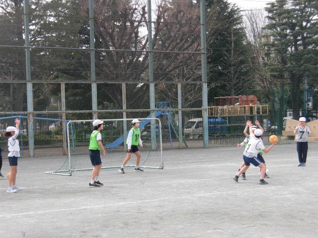 ハンドボールの要領でボールをゴールに運びます。味方からパスをもらうことのできる場所まで子どもたちはすばやく動いています。空いているスペースを見つけるのがうまくなってきている5年生です。