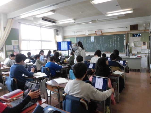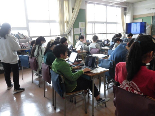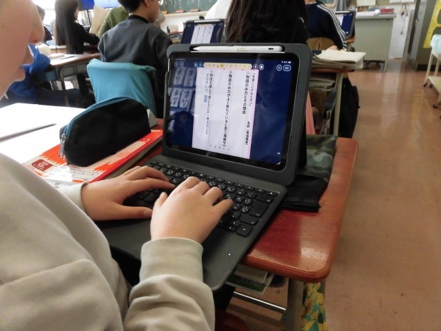 登場人物の心情について読み取ったことをタブレットのワークシートに書きこんでいます。物語のどの文章からそう感じたかを子どもたちはかきこんでいます。