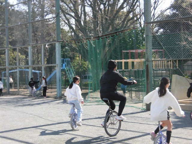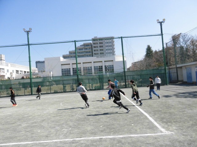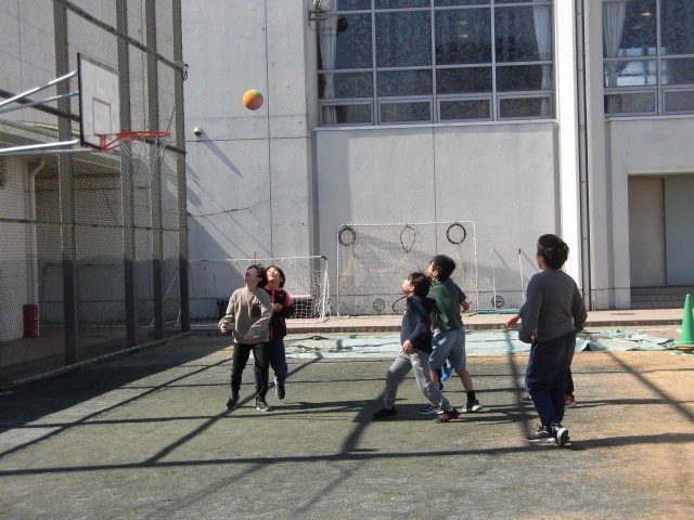 中休みです。気持ちのよい青空です。6年生がサッカーをしています。あと1か月で中学生になる6年生、身体が大きいのですごい迫力です。4年生はバスケットボールをしています。4年生は最近バスケットボールがブームのようです。
