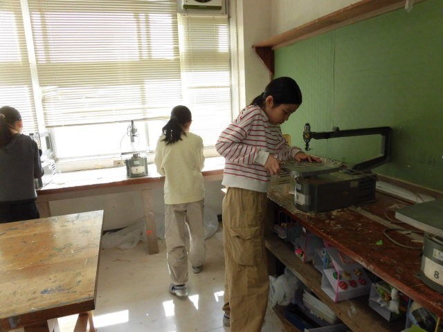 4年生の授業は木版画です。子どもたちは版にインクを付け、刷っています。刷り上がりを見て嬉しそうにしています。
