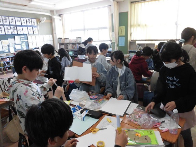 子どもたちは理科で学習した、いろいろな作用のあるおもちゃを作っています。グループでつくっているところもあれば、個人で作っている人もいます。いろいろなおもちゃがあります。子どもたちはとても楽しそうです。学習したことを遊びに生かしている3年生です。