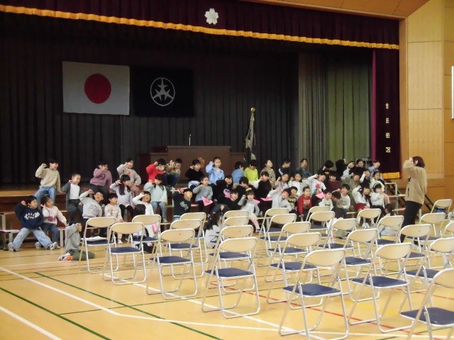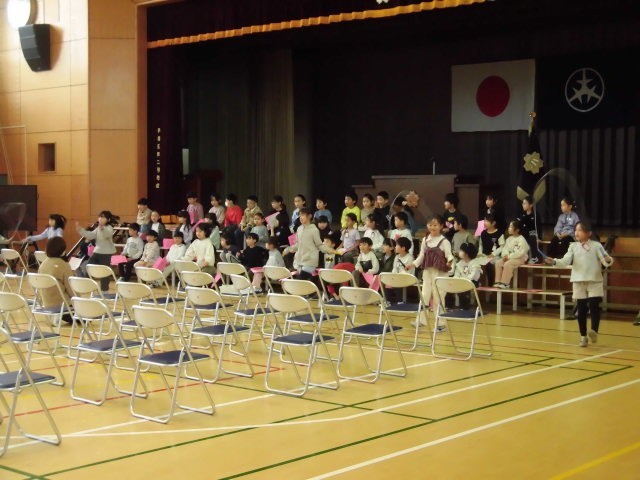 1年生は体育館で入学式の出しものの練習をしていました。呼びかけの中での細かな動きの確認をしていました。頑張って練習をする1年生です。