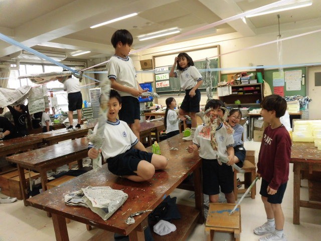 みんなで秘密基地を作っています。図工室が秘密基地に大変身です。子どもたちはみんな目をキラキラさせています。「ここ見て!」いろいろな工夫があるようです。