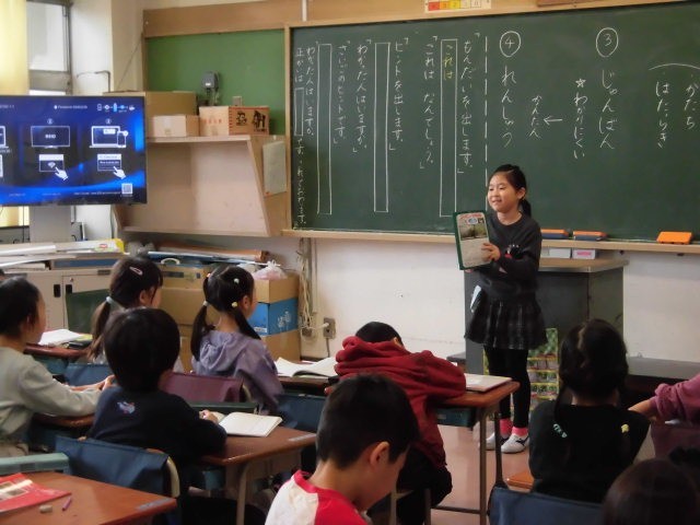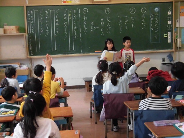 1年生の教室ではクイズ大会をしていました。国語の学習でもあるのでしょう。