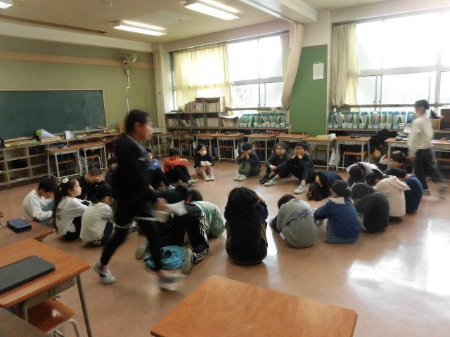 教室では知らないように早歩きで楽しんでいる子どもたちです。伏せている人たちもとても楽しそうです。