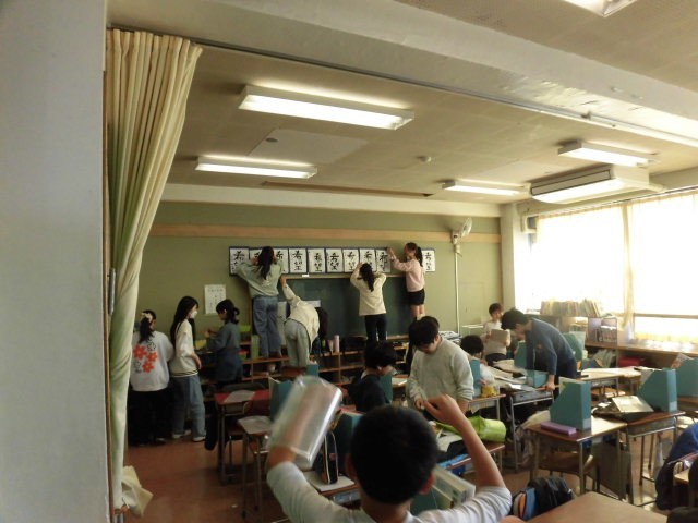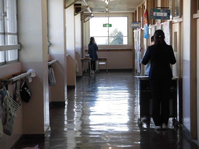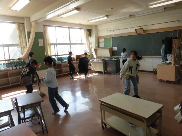 各教室をまわると、大掃除をしているクラス、大掃除が終わり通知表をもらっているクラスなどがありました。大掃除では、ドアのサッシなど細かいところまで一生懸命に掃除をしている子どもたちです。通知表をもうっている子どもたちの表情はとても真剣でした。