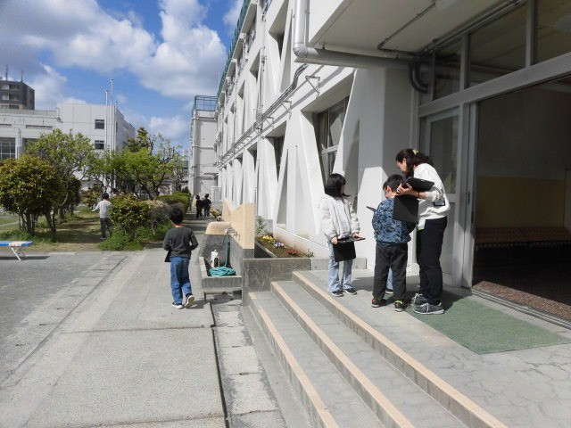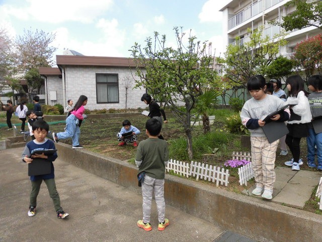 3年生の授業は理科です。二クラスとも校庭に出て、春を探しています。