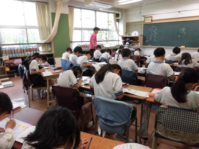 4年生の授業は国語です。漢字の練習をしています。教室に入ると、あまりにも静かなのでびっくりしてしまいました。物音が全くありません。歩くのにも気を使ってしまうくらいです。子どもたちは、わたしが教室に入ってきたことにも気付いていなかったに違いありません。
