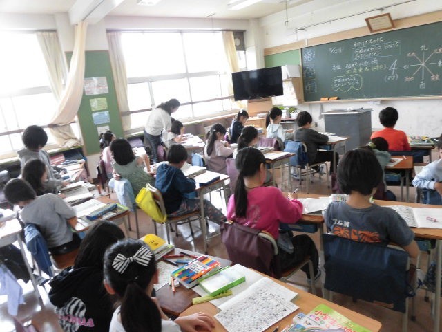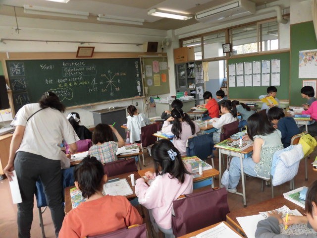 3年生の授業は社会です。3年生の社会は世田谷区の学習が中心です。はじめに近隣の町並みの学習をします。地図を見ることが多くなるので、まず方角の学習をしています。東西南北を確認した後、方角を使ったマス進みをしています。子どもたちは楽しそうに先に進んでいます。早くできた人は、まだの人に教えてあげています。楽しみながら方角の学習している子どもたちです。