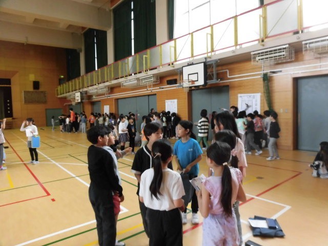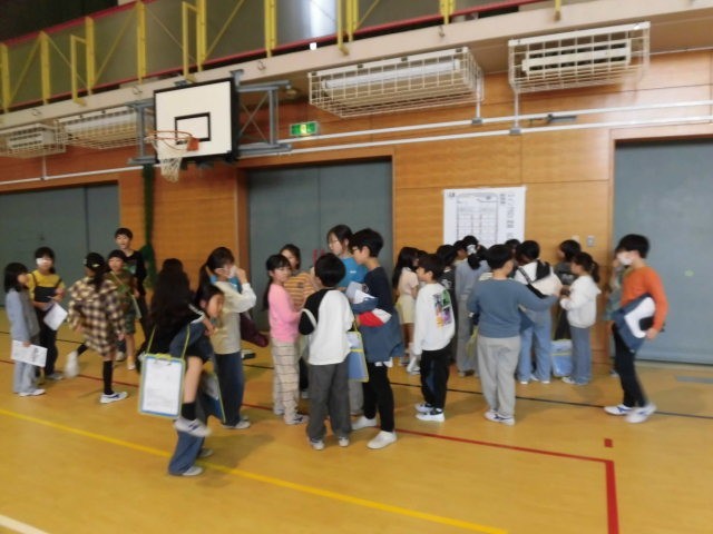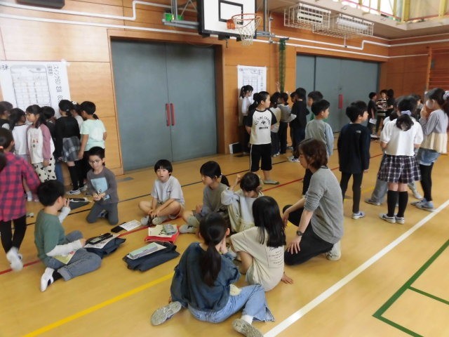 3年生と4年生は体育館に集まって、今週の金曜日にある遠足の打ち合わせをしています。