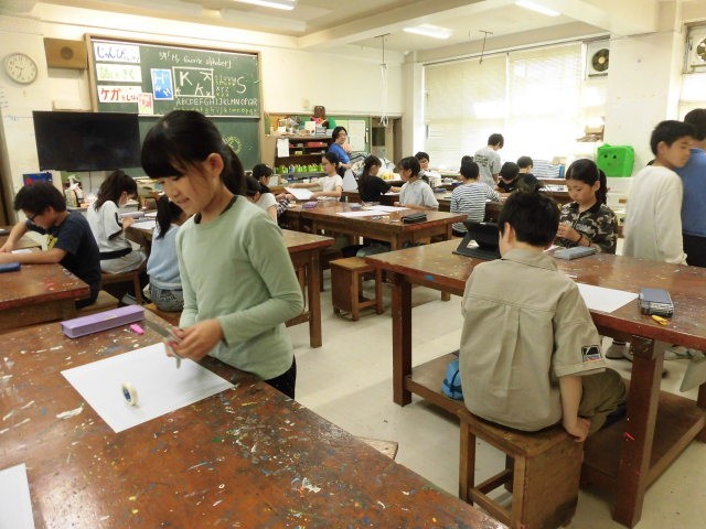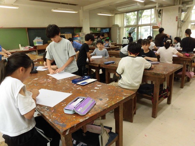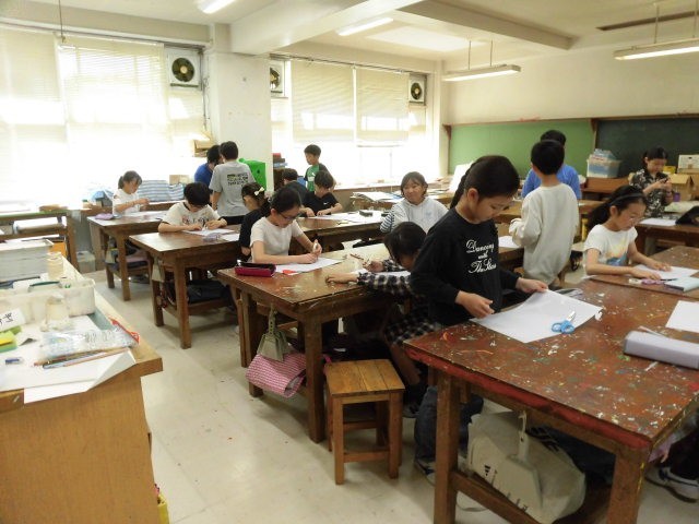 5年生の授業は図工です。好きなアルファベットを使ってデザインを作っています。一人ひとり選ぶアルファベットが異なります。自分の名前にあるアルファベットを選んでいる人が多いようです。そのアルファベットの形を紙テープで画用紙にはり、上から絵の具を塗り、乾いてから紙テープをはがすようです。