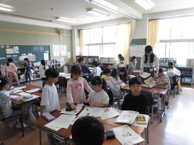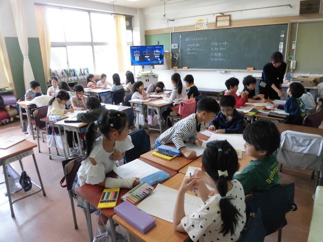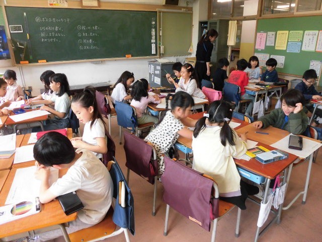 2年生の教室では1年生を案内する学校探検の準備をしていました。各教室のポスターを作っています。