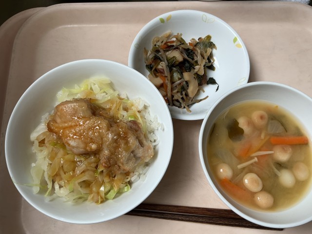 献立 鶏の照り焼き丼 ちくわの煮びたし お麩の煮びたし 牛乳