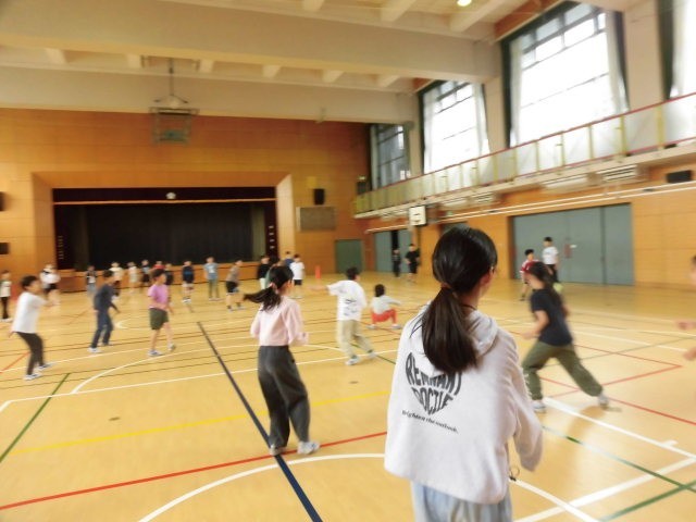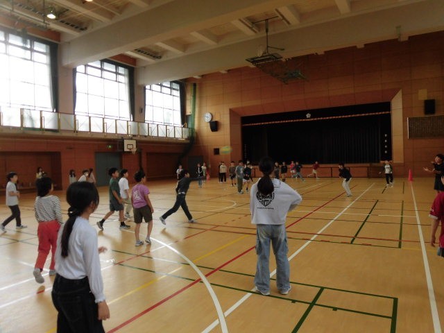 5年生は学年で体育館に集まって、学年でレクレーションをしていました。自分たちで遊びを計画して行っているようです。